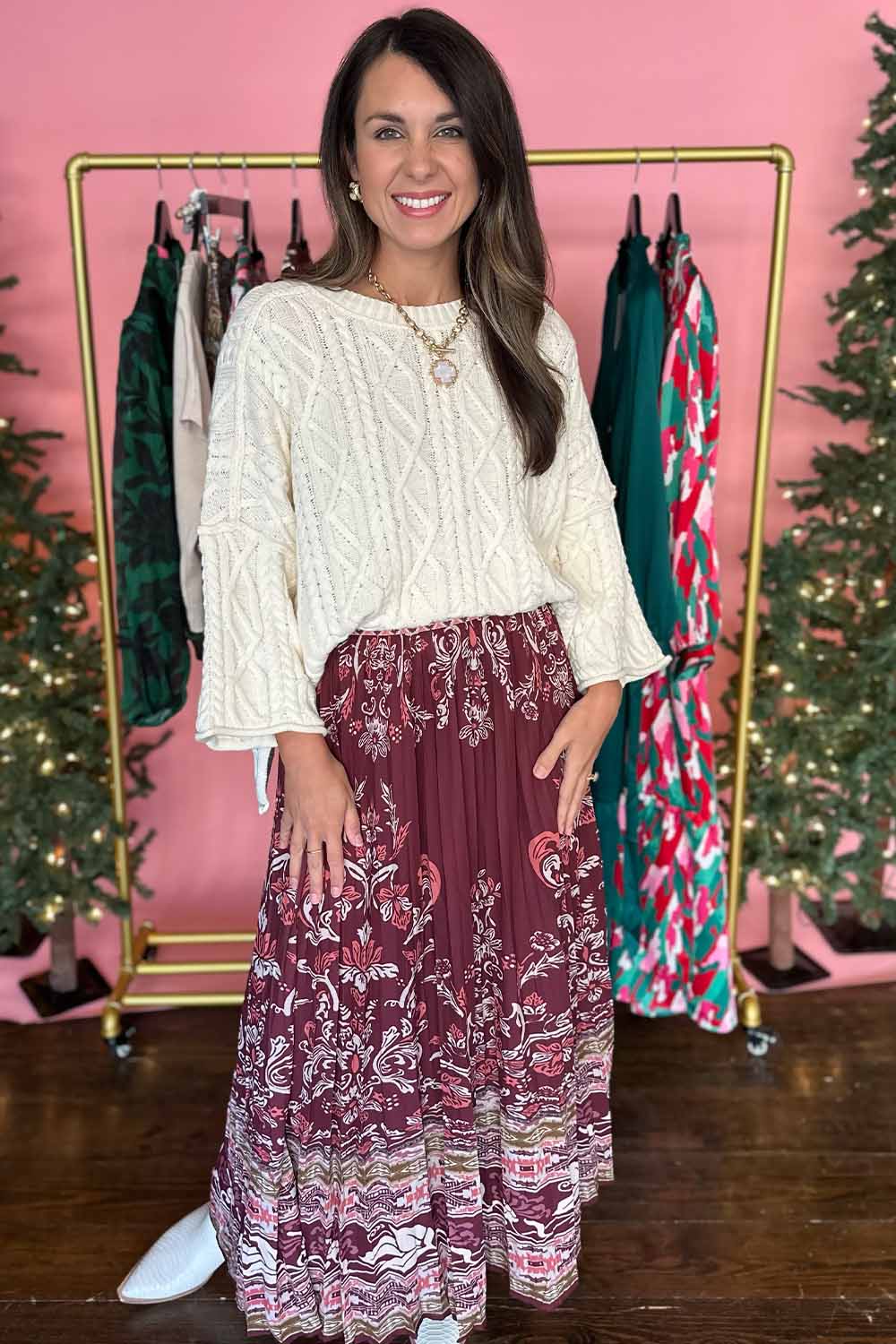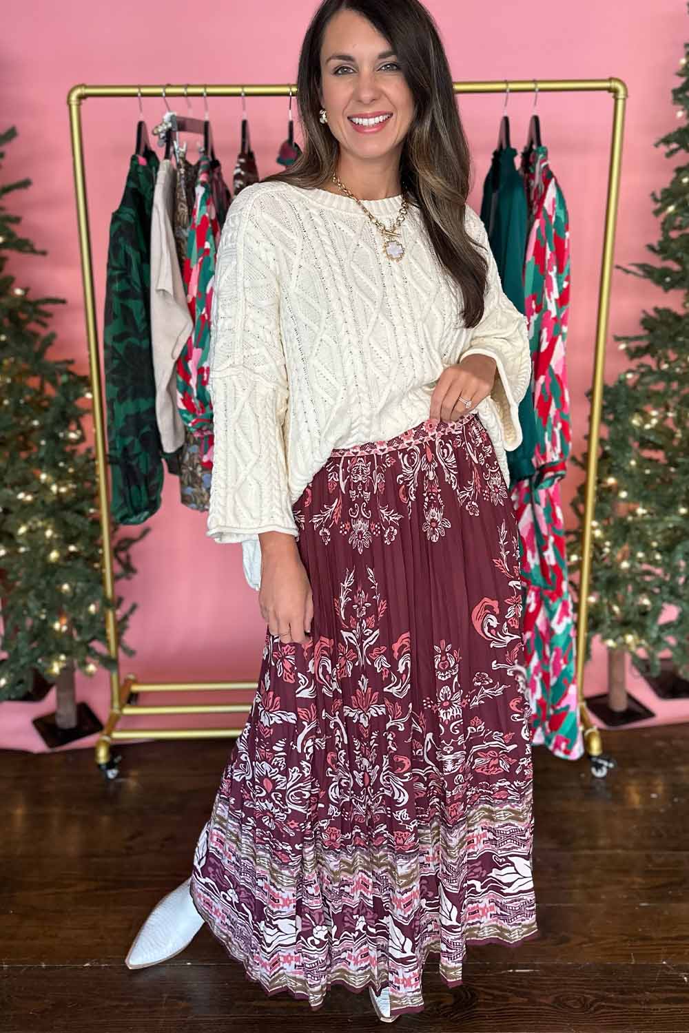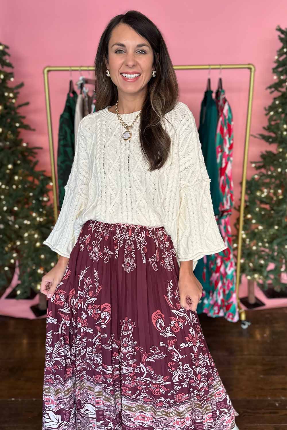 Elevate your everyday style with this burgundy printed pleated midi skirt that's equal parts sophisticated and fun. The flattering pleated design creates beautiful movement with every step, while the vibrant print adds personality to any outfit. A convenient side zip makes getting dressed effortless, and the lined interior ensures comfort and coverage all day long. Perfect for dressing up or down, this versatile piece is ready for whatever your day brings.Model is wearing a size small.