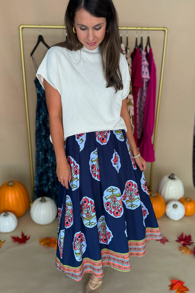 Navy Floral Printed Midi Skirt