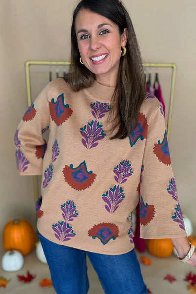 Tan Purple Rust Wide Sleeve Sweater