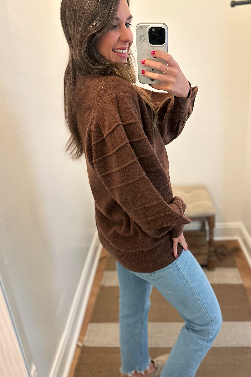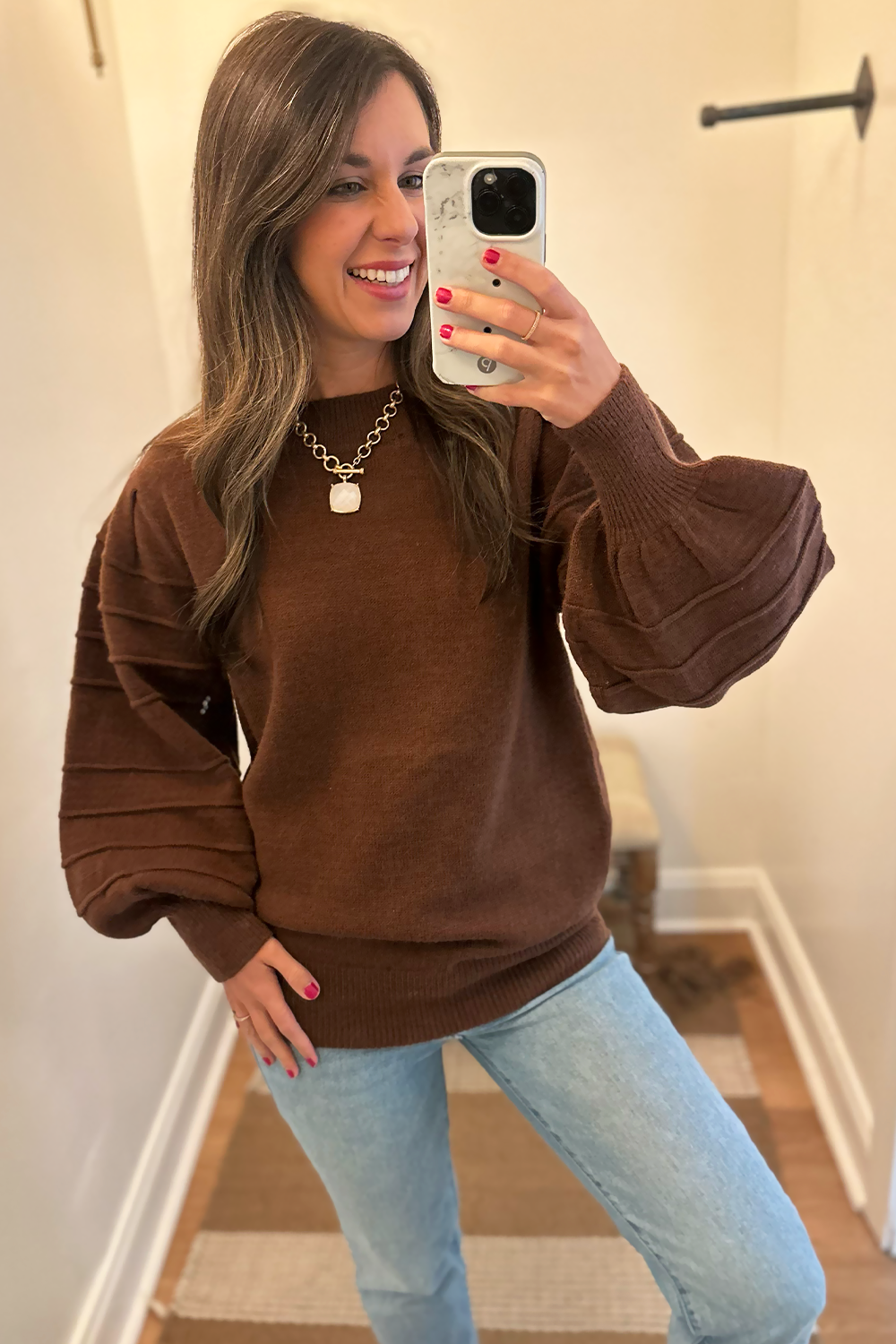 Wrap yourself in cozy style with this chocolate brown sweater that's having a major moment. The crew neck keeps things classic while those balloon sleeves with ribbed detailing add just the right amount of playful flair. Perfect for layering over your favorite tee or pairing with jeans for an effortlessly chic look that works whether you're running errands or catching up with friends. Model is wearing a size small.