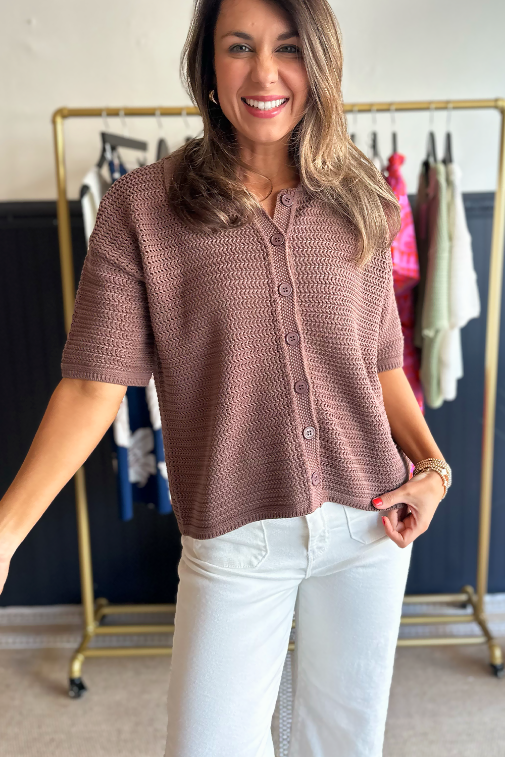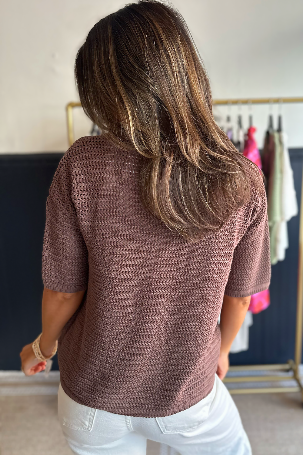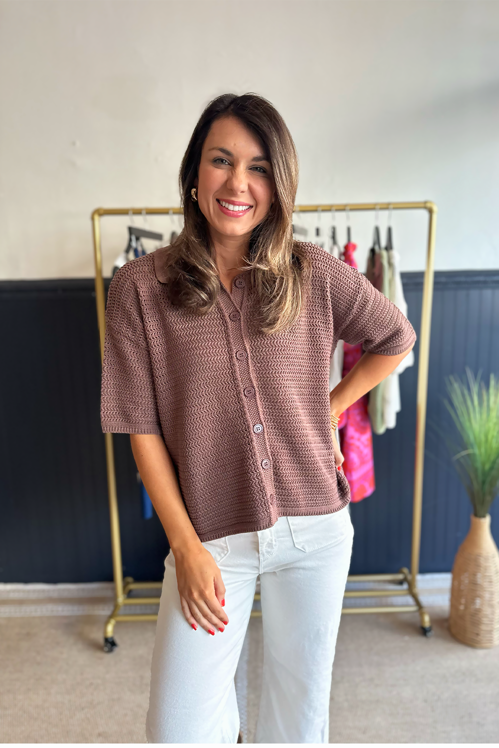 This top features a beautiful open knit construction that creates dimension and allows your skin to breathe. The rich coco color is the perfect neutral—warm and sophisticated, it pairs beautifully with everything in your wardrobe. The classic collar adds a refined touch, while the button-front design gives you styling flexibility. Wear it fully buttoned for a polished look or leave a few buttons undone for relaxed, casual charm.