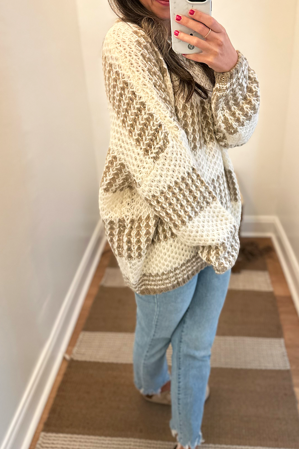 Snuggle up in style with this delightfully soft mocha and cream striped sweater. The open knit construction keeps things light and breathable, while the relaxed silhouette lets you lounge in total comfort. Effortlessly cozy yet put-together, this sweater is your new go to! Model is wearing a size small.