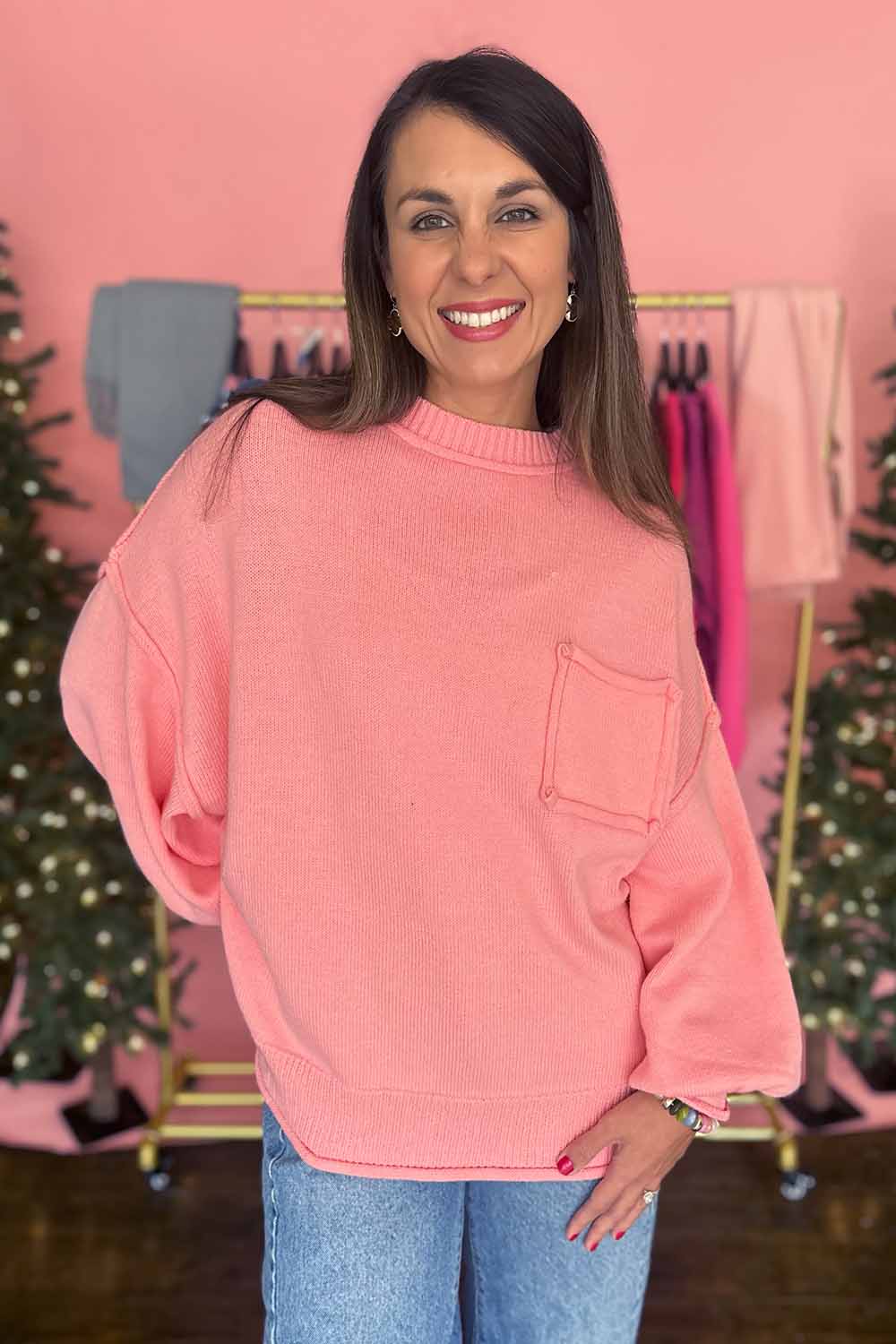 Slouchy, soft, and seriously stylish—this light pink sweater is your new wardrobe MVP. The generous oversized fit pairs perfectly with dramatic balloon sleeves that steal the show, while a functional chest pocket keeps your essentials close. A rolled hemline adds that polished finishing touch to an otherwise wonderfully relaxed design. Throw it on and feel instantly put-together, no effort required. Model is wearing a size small.