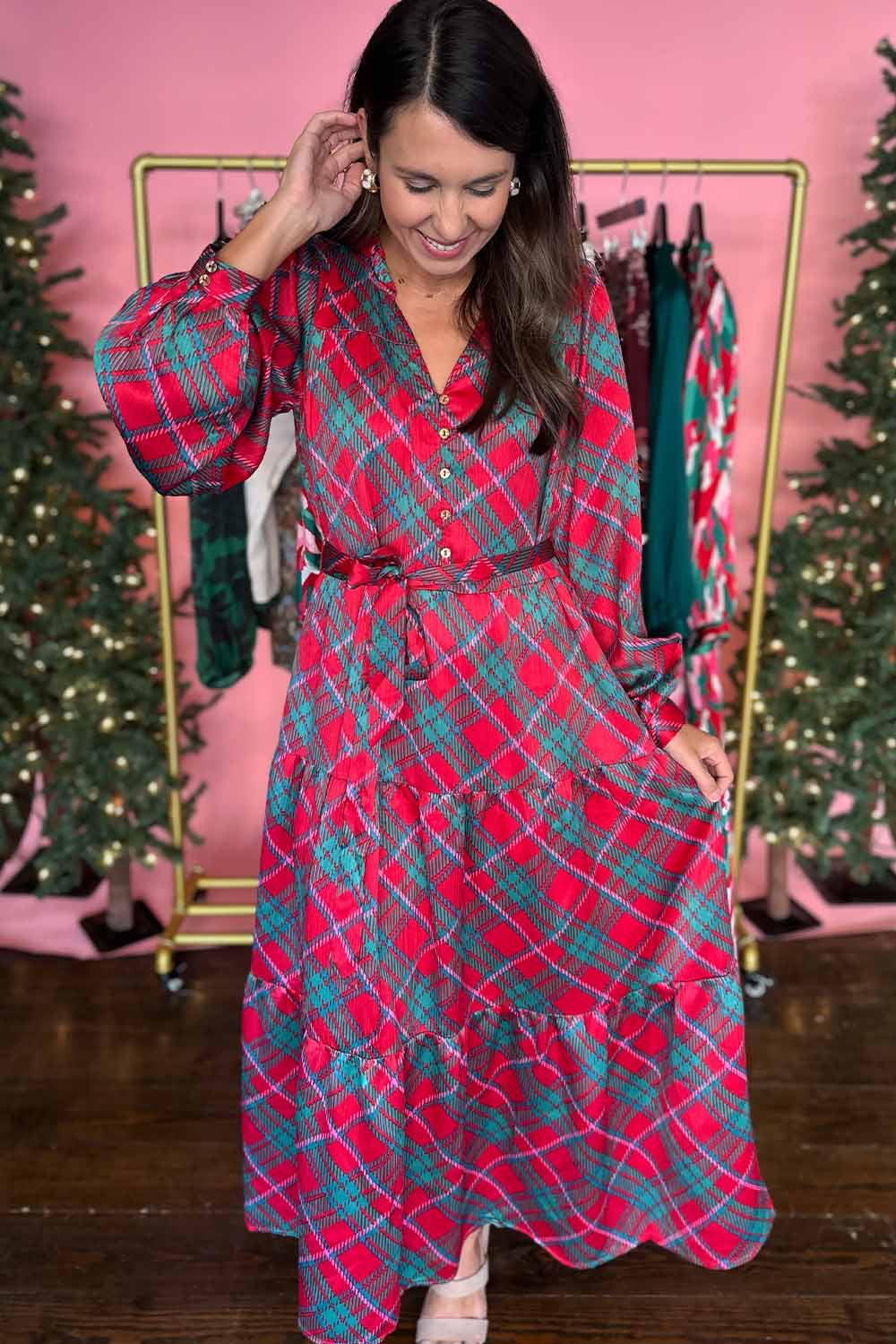 Wrap yourself in holiday magic with this silky plaid midi dress that screams festive cheer. The rich red and green pattern delivers that classic seasonal vibe, while long sleeves keep you cozy through winter celebrations. The adjustable tie waist cinches perfectly for a flattering fit that works for holiday parties, family gatherings, or any occasion calling for a touch of timeless elegance. Effortlessly stylish and undeniably merry. Model is wearing a size small.
