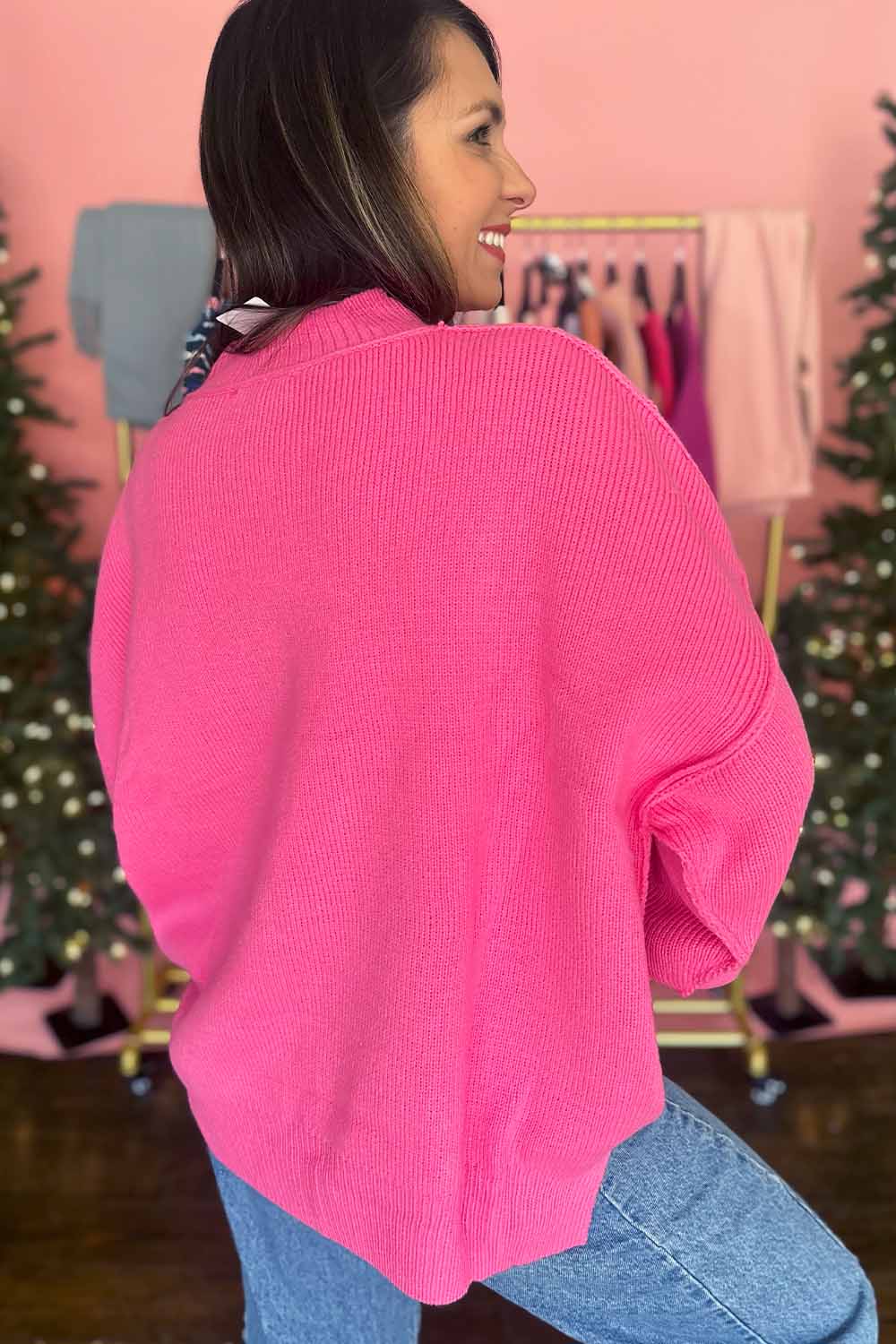 Meet your new favorite sweater—soft, slouchy, and ready to steal the show. This bright pink pullover rocks a trendy drop shoulder with an exposed seam for that effortlessly cool vibe, while the split hemline keeps things playful and unexpected. Layer it, style it solo, or throw it on when you need instant comfort without sacrificing style. Model is wearing a size small.