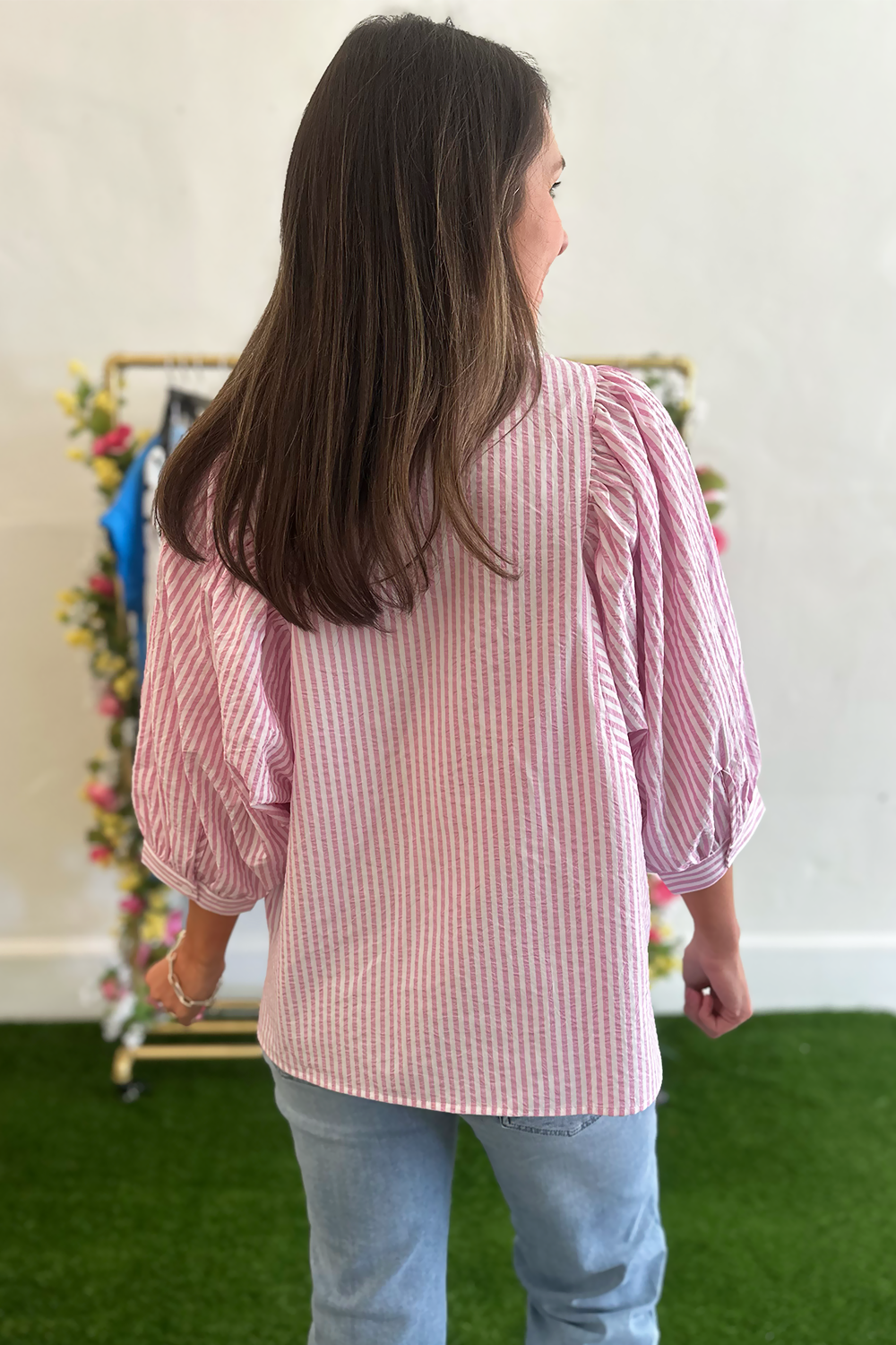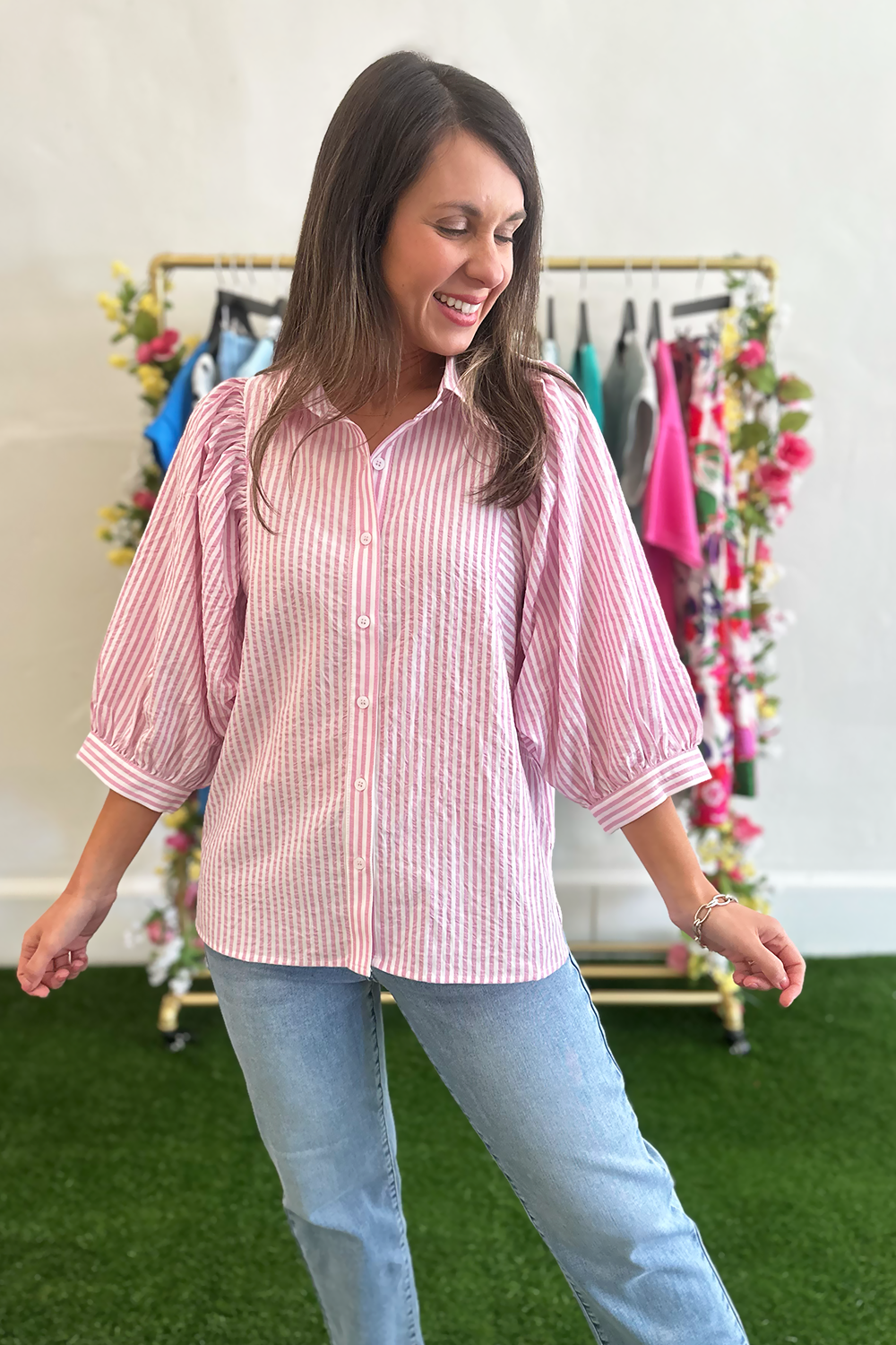 Add a fresh, feminine touch to your wardrobe with this charming pink stripe button down blouse. The classic stripes and crisp button-down silhouette create a polished yet playful look that transitions effortlessly from work to weekend.